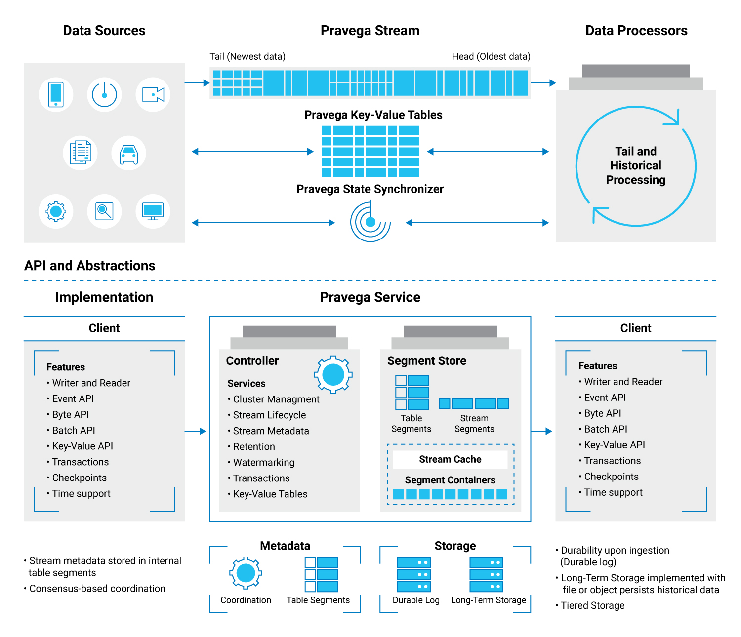 Distributed messaging systems such as Kafka and Pulsar have provided modern Pub/Sub infrastructure well suited for today’s data-intensive applications. Pravega further enhances this popular programming model and provides a cloud-native streaming infrastructure, enabling a wider swath of applications. Pravega streams are durable, consistent, and elastic, while natively supporting long-term data retention. Pravega solves architecture-level problems that former topic-based systems Kafka and Pulsar have failed to solve, such as auto-scaling of partitions or maintaining high performance for a large number of partitions. It enhances the range of supported applications by efficiently handling both small events as in IoT and larger data as in videos for computer vision/video analytics. By providing abstractions beyond streams, Pravega also enables replicating application state and storing key-value pairs.