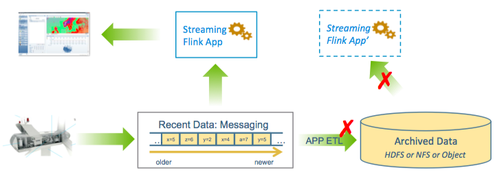 Figure 10 shows a typical deployment today for a real-time Flink app. Information is fed into a messaging system, processed by a Flink app, and then forwarded to a NOC or similar framework for display and/or action. In parallel, ETL workers continuously pull messages and write them to a durable store for historical access.