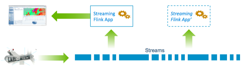 How does this change with Pravega streams? App’ is deployed exactly like production since historical data is accessed via the same stream – just rewind it! When history is consumed, App’ and App are processing the same data with the same state. When we are confident App’ is good, turn off App and redirect the NOC. Sweet!