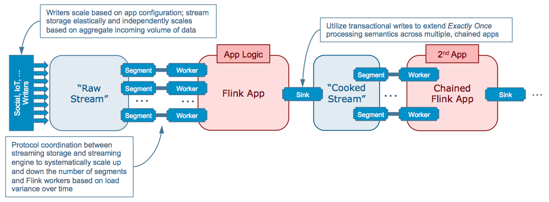 Two integration points enable this: Pravega’s segment scaling driving Flink’s worker scaling, and chaining apps via streams preserving exactly once across the system. Deploy your Flink app with just one worker, and dynamically scale it based on stream SLO. Nice! Pravega and Flink developers are already integrating stream auto-scaling into Flink.