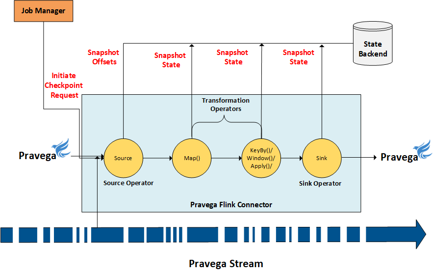 - The source operator records the checkpoint state (Reader Group Checkpoint reference) in the state backend and advances the barrier to the next downstream operator.