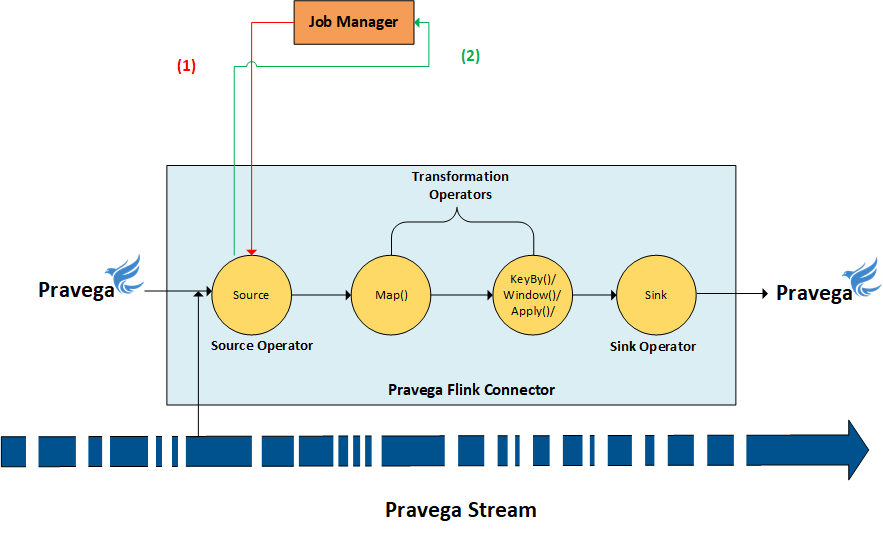 - Job Manager requests FlinkPravegaReader to provide Checkpoint hook instance that it could use to initiate the Checkpoint request to Pravega.
