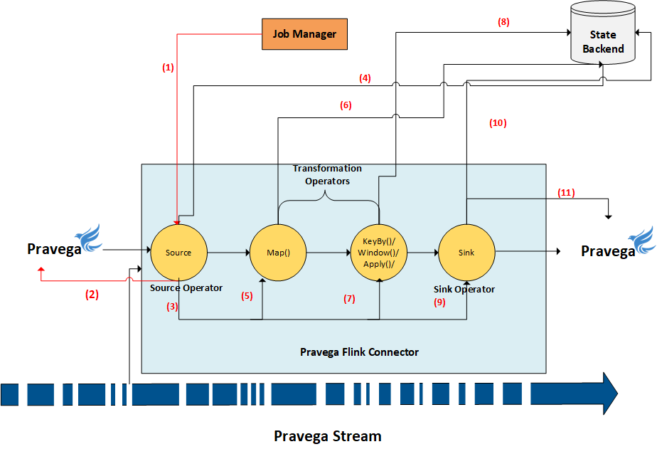 In the previous diagram, after the barrier is advanced to the sink operator (FlinkPravegaWriter) step (11) performs a “flush()” API call to the transaction instance which results in ensuring that the writes are persisted. The current transaction instance along with the Checkpoint ID, will be stored in the state backend, after which a new transaction will be opened to accommodate any subsequent writes that are performed after the current checkpoint operation.