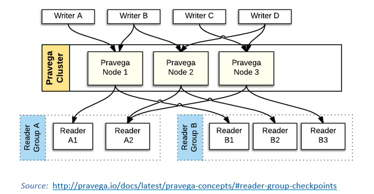 2) The other scenario could stem from the fact that the readers that are reading events from a stream could end up in processing duplicate events if the reader offsets are not appropriately managed. A failed reader when restarted should not reload the events that are already consumed and processed. Pravega addresses this problem by allowing the readers in the Reader Group to periodically checkpoint the reader state and ensure that duplicate events are not routed across the readers.