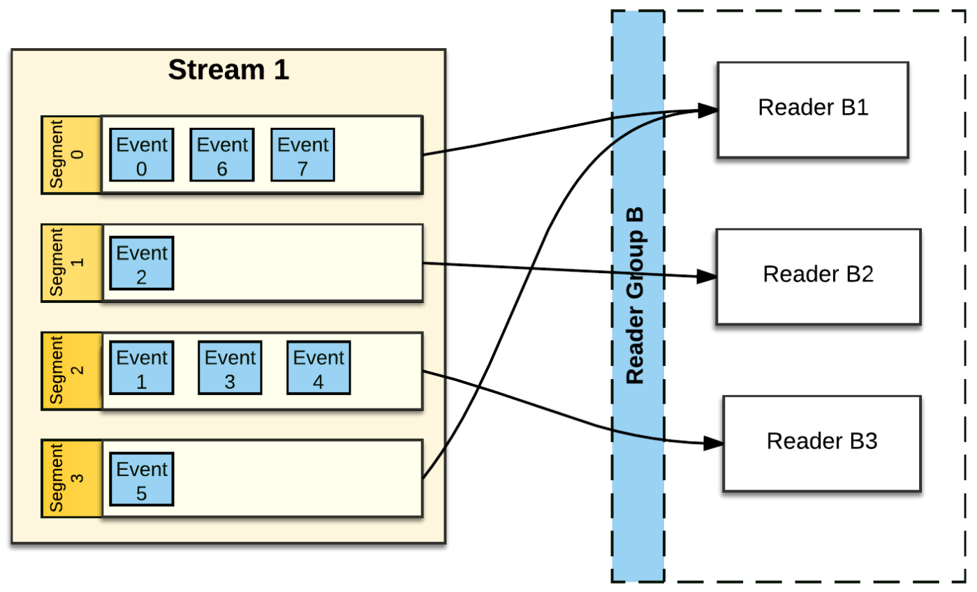 Reader Groups: Readers are grouped into Reader Groups to read from one or more Streams in parallel. For any Reader Group reading a Stream, each Stream Segment is assigned to one Reader in that Reader Group.